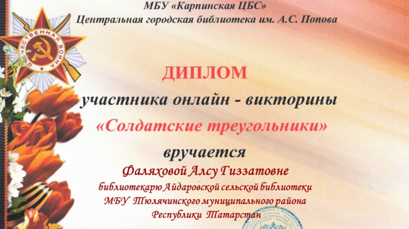 Айдар авыл китапханәсе Бөек Ватан сугышында җиңүнең 75 еллыгына багышланган "Солдат өчпочмагы» дигән интернет - викторинада катнашып, диплом белән бүләкләнде. Акциянең оештыручысы- Карпинск шәһәр округының А.С.Попов исемендәге шәһәр үзәк китапханәсе.