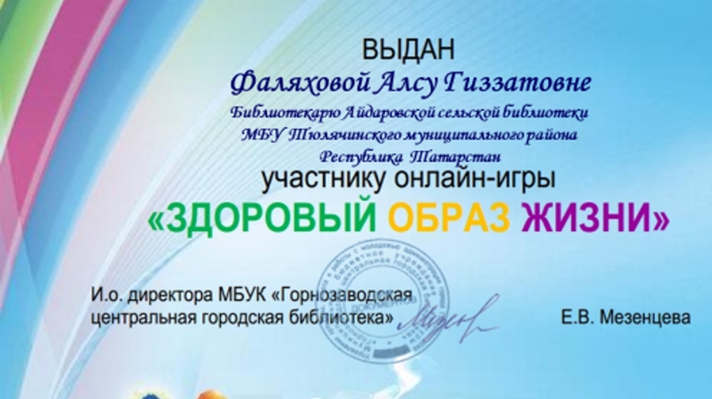 Теләче районы Айдар авыл китапханәсе "Сәламәт яшәү рәвеше"дип исемләнгән онлайн-уенда катнашты. Акциянең оештыручысы-Горнозавод Үзәк шәһәр китапханәсе.