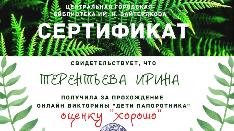 Ул 7 июльдә билгеләп үтелә торган борынгы һәм серле Иван Купала бәйрәменә багышланган. Шармыш авыл китапханәсе викторинада катнашып Сертификатка ия булды.
