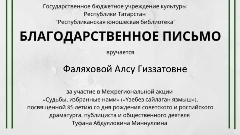 Айдар авылы китапханәчесе Фаляхова А.Г., драматург, публицист Т. А. Миңнуллинның тууына 75 ел тулуга багышланган «Үзебеә сайлаган язмыш» төбәкара акциясендә катнашып Рәхмәт хаты белән бүләкләнде.