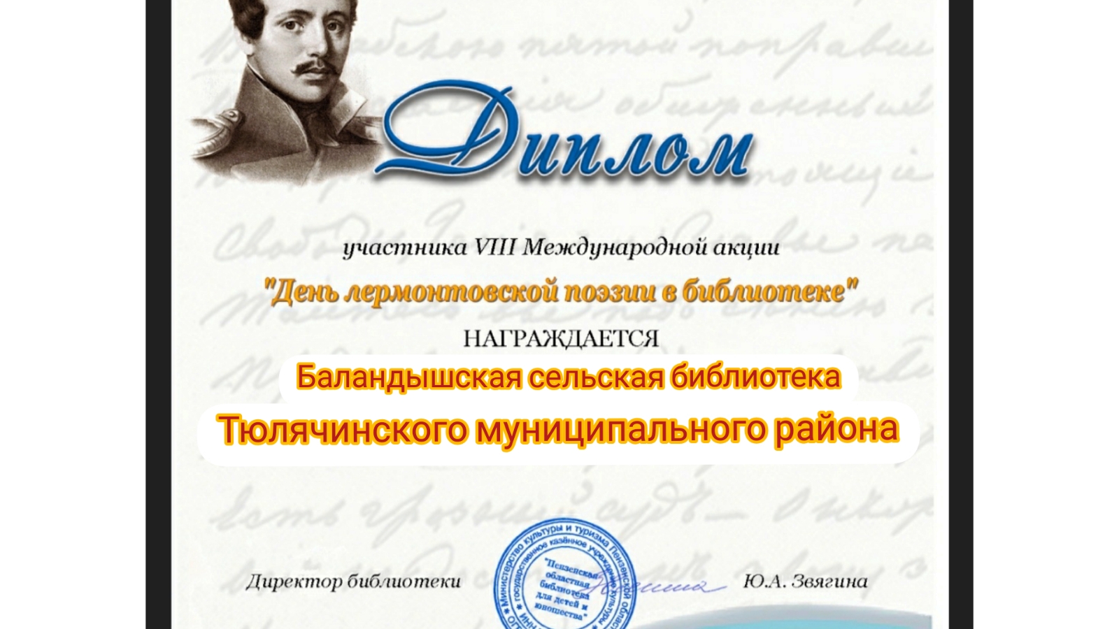 Баландыш авыл китапханәсе "Китапханәдә Лермонтов шигърияте көне" Халыкара акциясендә катнашты һәм Диплом белән бүләкләнде.