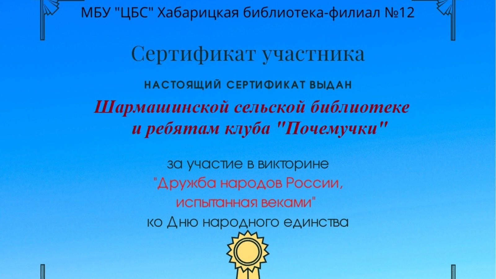 Хабариха китапханәсе һәркемне белемнәрен сынап карарга "Россия халыкларының дуслыгы" викторинасында катнашырга чакырды. Шармыш авылы китапханәчесе һәм "Почемучки" клубы балалары әлеге викторинада катнашып Сертификатка ия булды.