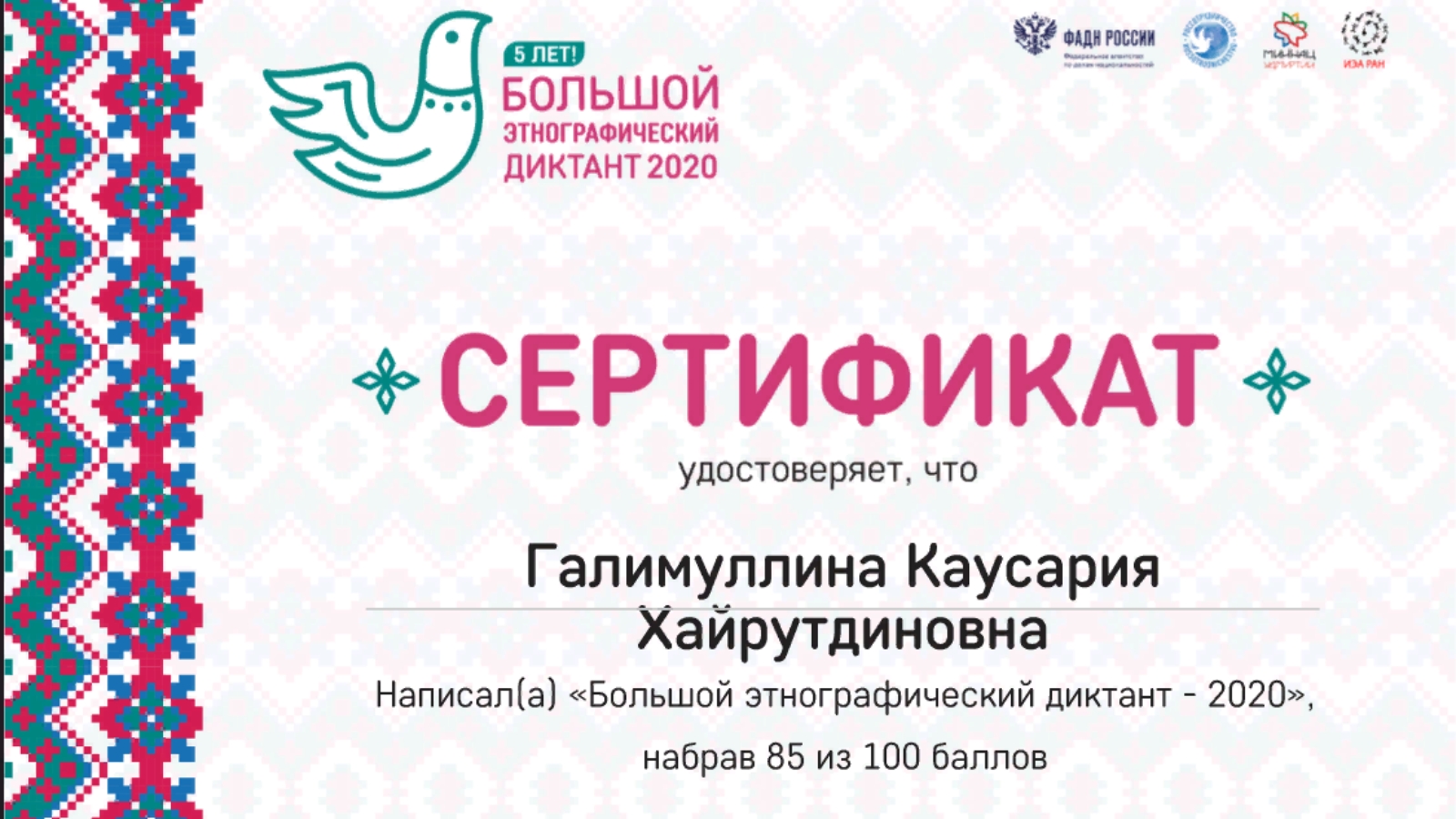 “Зур этнографик диктант " акциясендә катнашучы сертификатына ия булды.