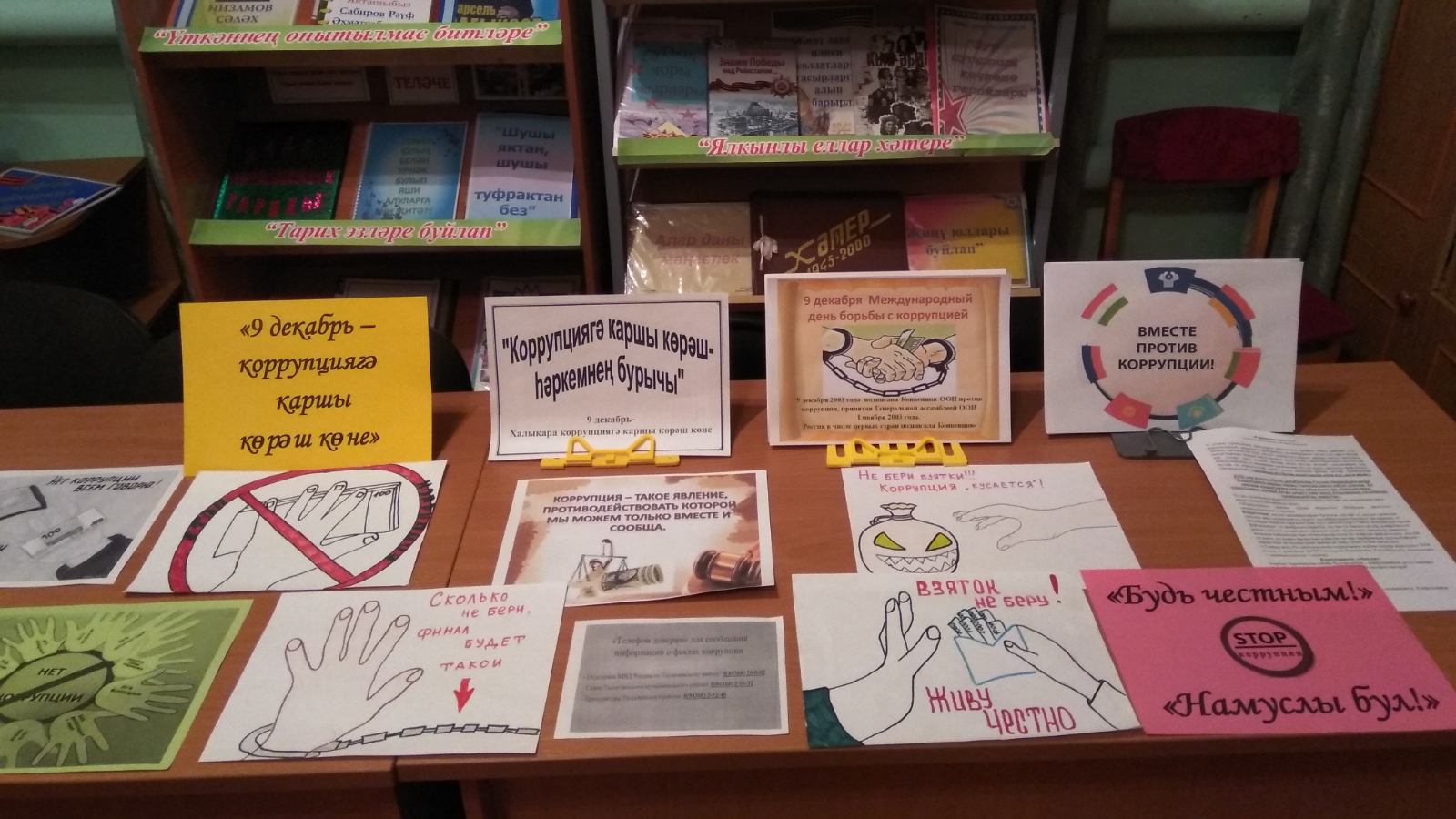 5 декабрь көнне Айдар авыл китапханәсендә, Халыкара коррупциягә каршы көрәш көненә багышланган, «Коррупциягә каршы көрәш-һәркемнең бурычы» дип исемләнгән рәсемнәр күргәзмәсе оештырылды. Конкурста "Тамчы" берләшмәсенә йөрүче укучылар катнашты. Укучылар ясаган рәсемнәре аша коррупциянең нинди куркыныч булуын һәм аңа үз карашларын белдерделәр.