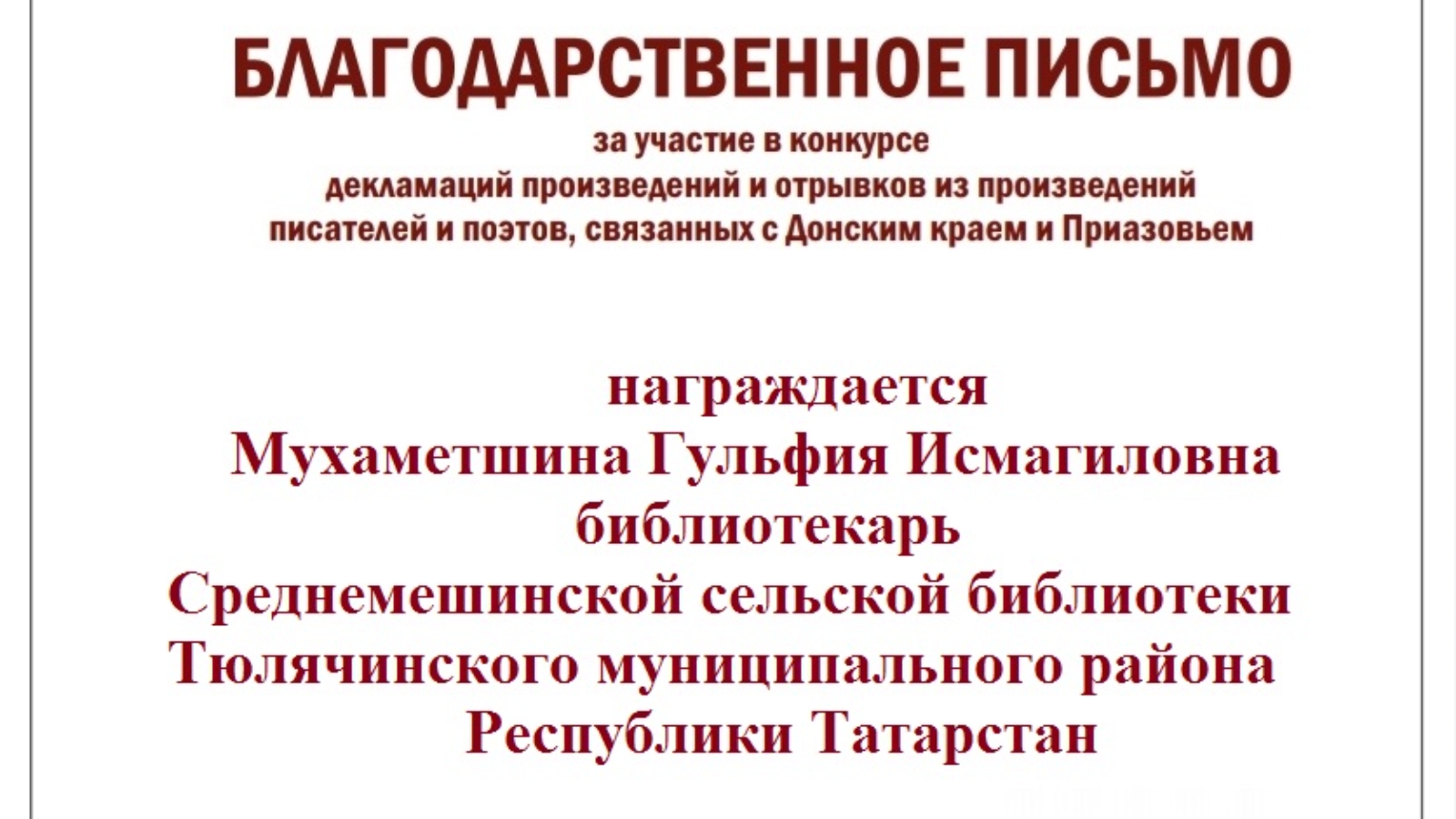 Татарстан Республикасы Теләче муниципаль районының Урта Мишә авылы китапханәчесе Мөхәммәтшина Гөлфия Исмәгыйль кызы "Узнай Россию. Донское слово" исемле конкурста А.П. Чеховның "Каштанка" әсәре белән катнашып, Рәхмәт хаты белән бүләкләнде.