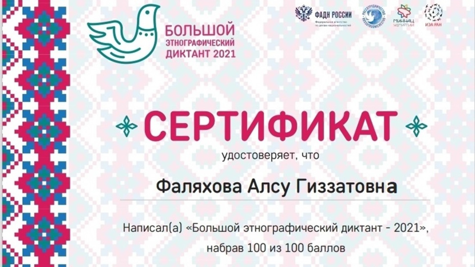 «Зур этнографик диктант» халыкара мәгърифәтчелек акциясе 2021 елның 3 ноябреннән 7 ноябренә кадәр онлайн форматта уздырыла. Әлеге диктант “Халыклар күп - ил бер генә” дигән лозунг астында алтынчы мәртәбә уза. Диктант халыкның этнографик белем дәрәҗәсен, Россиядә яшәүче халыклар турында белемнәрен бәяләргә мөмкинлек бирә. Ул киң җәмәгатьчелекнең игътибарын милләтара тынычлык һәм татулык мәсьәләләренә җәлеп итә. 7 ноябрь көнне Айдар авылы китапханәчесе А.Фаляхова да әлеге онлайн проектта катнашып 100 балл җыйды.