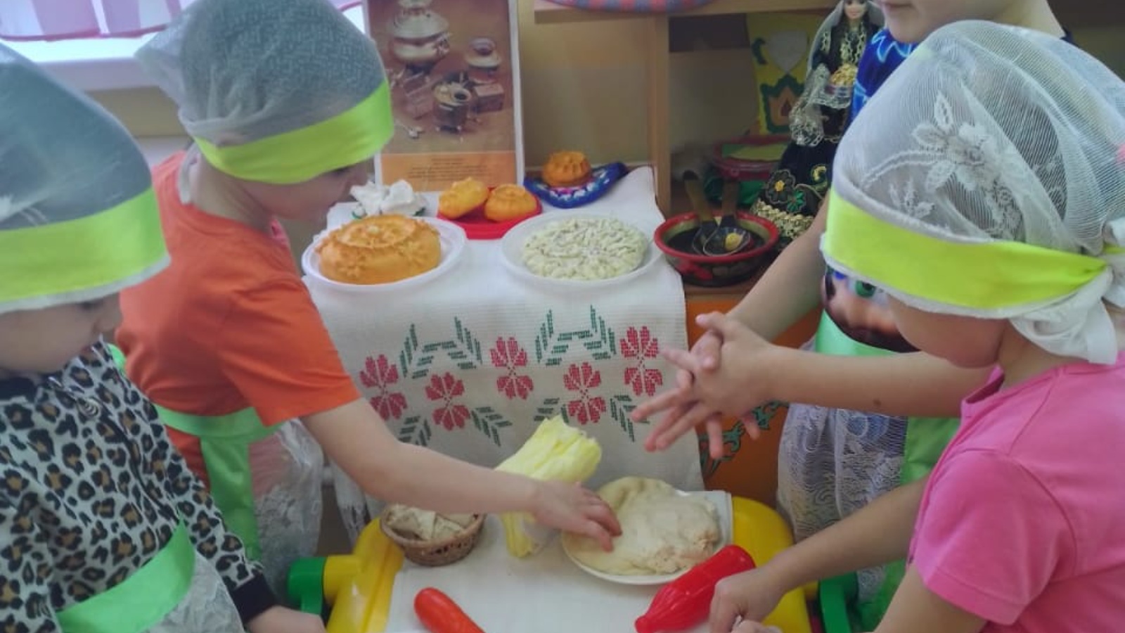 Теләченең 3нче номерлы балалар бакчасының зурлар төркеме тәрбияләнүчеләре бүген, 10 март көнне, пешекче,кулинар һөнәрләре белән таныштылар. Һөнәр ияләренең эшчәнлеге белән таныштылар. Тозлы камырдан татар милли ризыкларын: өчпычмак, вак бәлеш,кыстыбый ясадылар .
