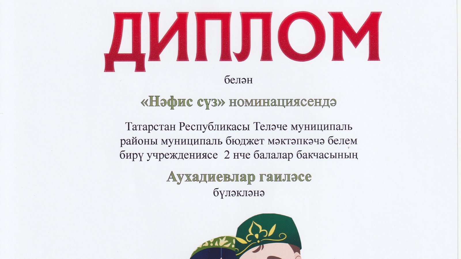 18 нче марттан 25 нче мартка кадэр Тубән Кама шәһәренең мэктәпкәчә белем бирү идарәсе боерыгы нигезендә “Туган тел “республика фестиваль -конкурсы булып узды .Конкурсның максаты: гайлә традицияләре нигезендә туган телгә мәхәббәтне арттыру, татар әдәбиятын популярлаштыру иде. Бу конкурста безнең балалар бакчасыннан ике гайлә катнашты. Г.Тукайнын “Су анасы”әкиятен сәхнәләштергэн Эүхәдиевлар гайлэсе (зурлар группасы) “Нэфис сүз” номинациясендә 2 нче дәрәҗә диплом белән бүләкләнделәр . А.Алишның “Ил гизүчеләр белән хәйлә сөючеләр” әкиятен сәхнәләштергән Фәсхиевлар гайләсе “Нәфис сүз” номинациясендә 1 нче дәрәҗә диплом белән бүләкләнделәр. Җиңүчеләрне кайнар котлыйбыз һәм яңадан яңа уңышлар телибез.