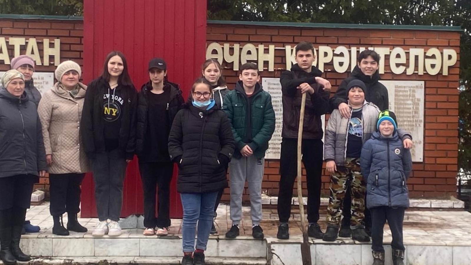 Кирәкле инвентарь һәм техника белән коралланып, Сауш мәктәбе укучылары актив рәвештә мемориал территориясен тәртипкә китерделәр: чүп-чар җыйдылар, юлны тәртипкә китерделәр. Һәйкәл янында тротуар плиткасы чистартылды, яу кырыннан кайтмаган якташларының исемнәре язылган бетон плитәләр юылды.