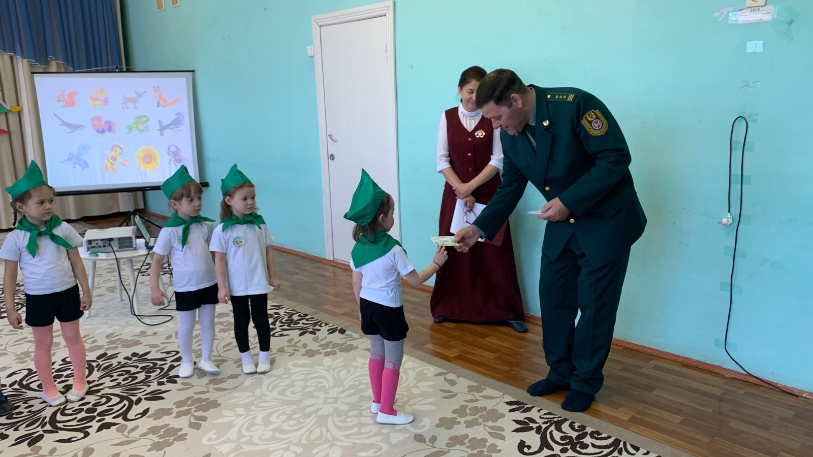 Соңыннан балалар нәни эколятлар гимнын башкардылар һәм яшь табигатьне саклаучылар антын өйрәнделәр.Чара ахырында балаларга хайваннар,үсемлекләр дөньясы һәм аерым саклана торган табигый территорияләр өлкәсендә дәүләт тикшереүе бүлегенең Теләче районы буенча район башлыгы Гаязов Эмил Әнвәр улы “Нәни эколог” исемен раслаучы документ тапшырды.