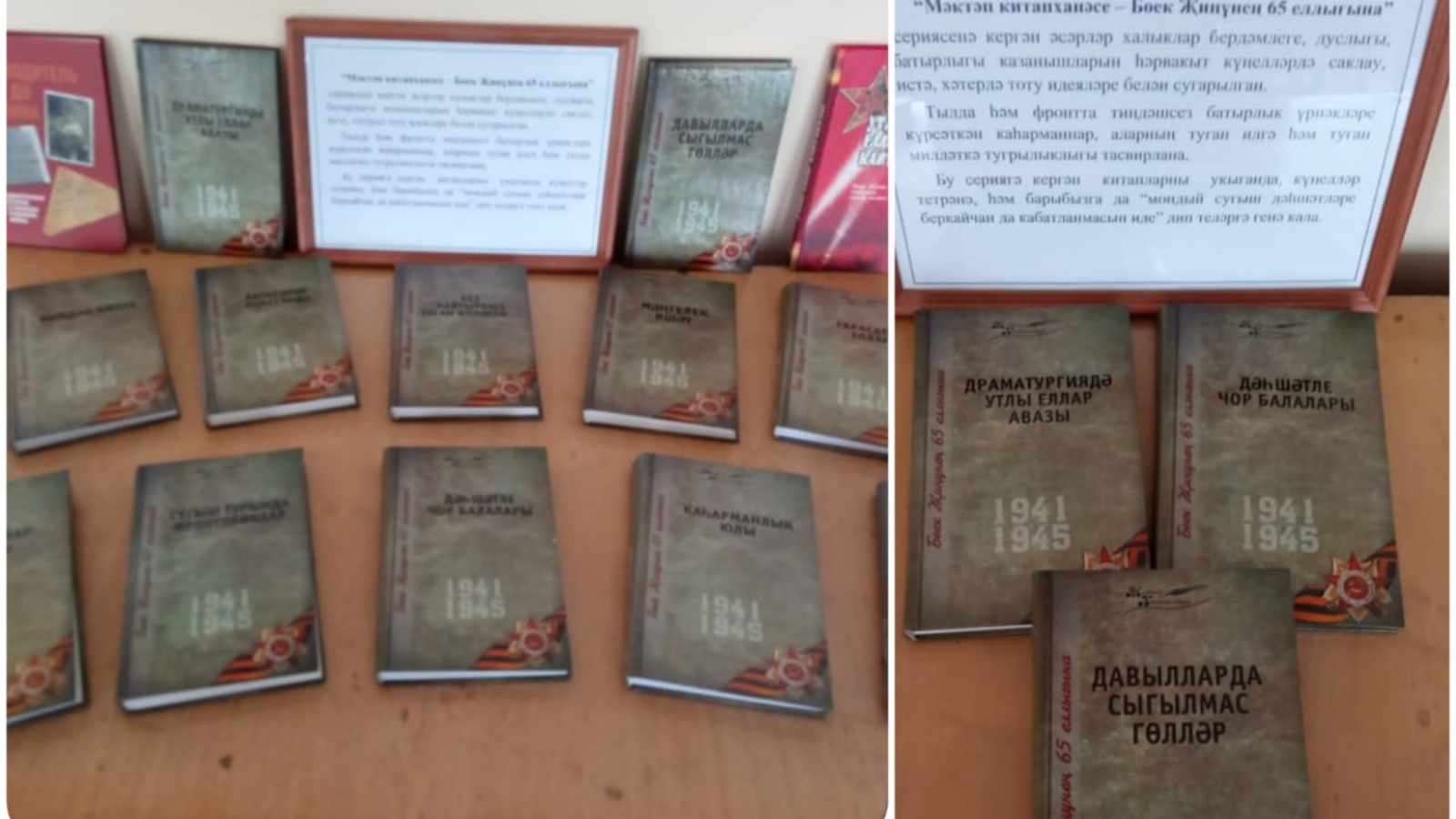 Олы Мишә урта мәктәбе китапханәсендә 15 томнан торган “Мәктәп китапханәсе – Бөек Җиңүнең 77 еллыгына” сериясеннән күргәзмә оештырылды. Бу сериягә тупланган әсәрләрдә, фронт истәлекләрендә, документаль язмаларда, очеркларда тылда һәм фронтта тиңдәшсез батырлык үрнәкләре күрсәткән каһарманнар, аларның туган илгә тугрылыклыгы тасвирлана.