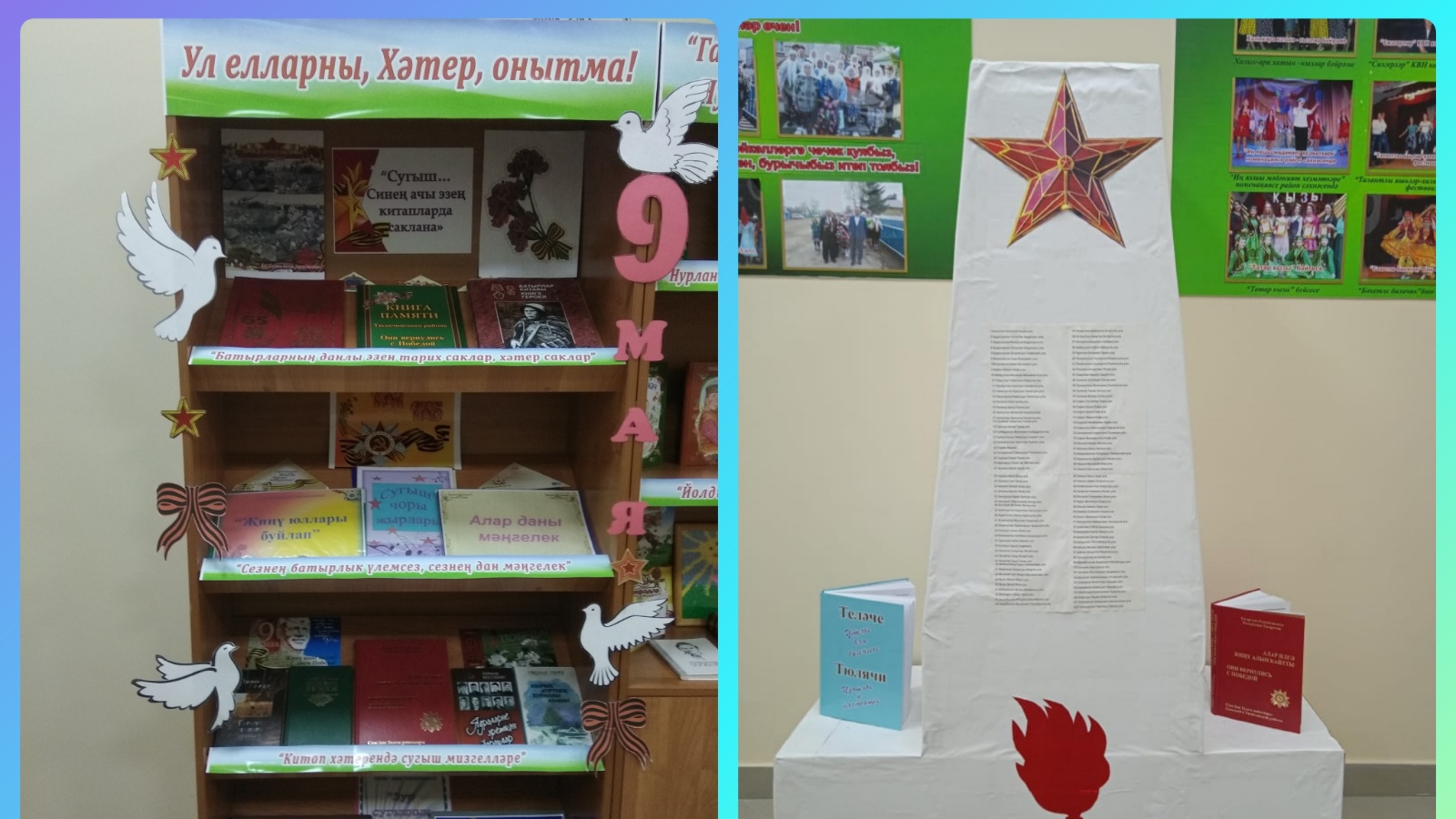 6-11 май көннәрендә Айдар авыл китапханәсе мәдәният йорты белән берлектә китап укучылар өчен "Ул елларны, Хәтер, онытма!" дип исемләнгән күргәзмә-экспозиция тәкъдим итте. “Сугыш, синең ачы эзең китапларда саклана” , "Батырларның данлы эзен тарих саклар, хәтер саклар", "Сезнең батырлык үлемсез, сезнең дан мәңгелек", "Ялкынлы еллар хәтере" бүлекләреннән торган күргәзмәдә сугыш чоры вакыйгалары турында әдәби әсәрләр, авылдашларыбызның, райондашларыбызның сугышчан юлын чагылдырган китаплар, истәлекләр, төрле кул эшләнмәләре тәкъдим ителде.