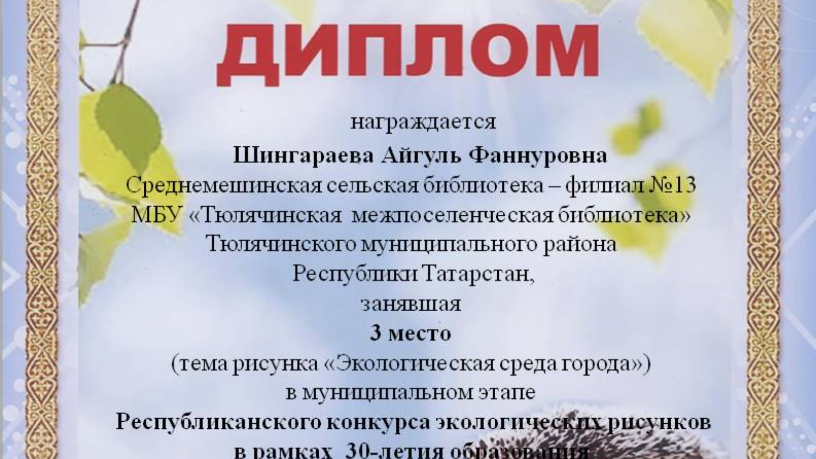 Конкурста катнашучылар түбәндәге темалар буенча төрле сюжетларны яктыртырга тиеш иде: “Саклана торган үсемлекләр һәм хайваннар”, “Эколог һөнәре”, “Шәһәрнең экологик мөһите”, “Планетаның киләчәге”. Бу конкурста Урта Мишә авылыннан, 5 класста укучы Шингарева Айгөл “Шәһәрнең экологик мөһите” исемле номинациясендә катнашып 3 нче урынга лаек булды һәм диплом белән бүләкләнде. Җитәкчесе - Урта Мишә авылы китапханәчесе Мухаметшина Г.И.