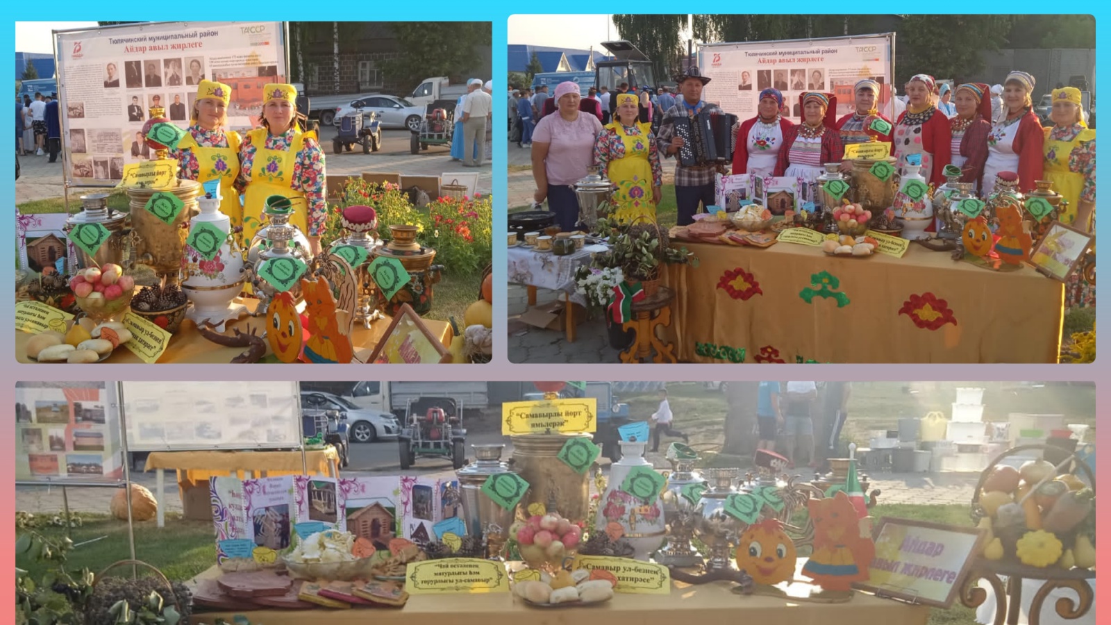 Шул уңайдан, Айдар авыл китапханәчесе , клуб хезмәткәрләре, авыл җирлеге белән берлектә 27 август көнне район мәдәният йорты каршындагы мәйданда республика көненә багышланган “Мәңге яшә, чәчәк ат син, Республикам минем Татарстан!» дип исемләнгән бәйрәм чарасында катнаштылар. Россиядә халык сәнгате һәм матди булмаган мәдәни мирас елы темасын яктырткан әлеге чарага «Чәй өстәленең матурлыгы һәм горурлыгы ул-самавыр» күргәзмәсе тәкъдим ителде. Көнкүрешебезгә яңадан-яңа уңайлыклар үтеп кергән заманда яшәсәк тә,самавырлы, коймаклы һәм хуш исле чәйле табын тирәсендә җыелмый һич мөмкин түгел! Халкыбыз самавырны рухи кыйммәтләргә тиңли. Чөнки тарихтагы иң катлаулы чорларда, туган нигезен ташлап китәргә мәҗбүр булганда да, кешеләр үзләре белән иң беренче чиратта самавырны алган.
