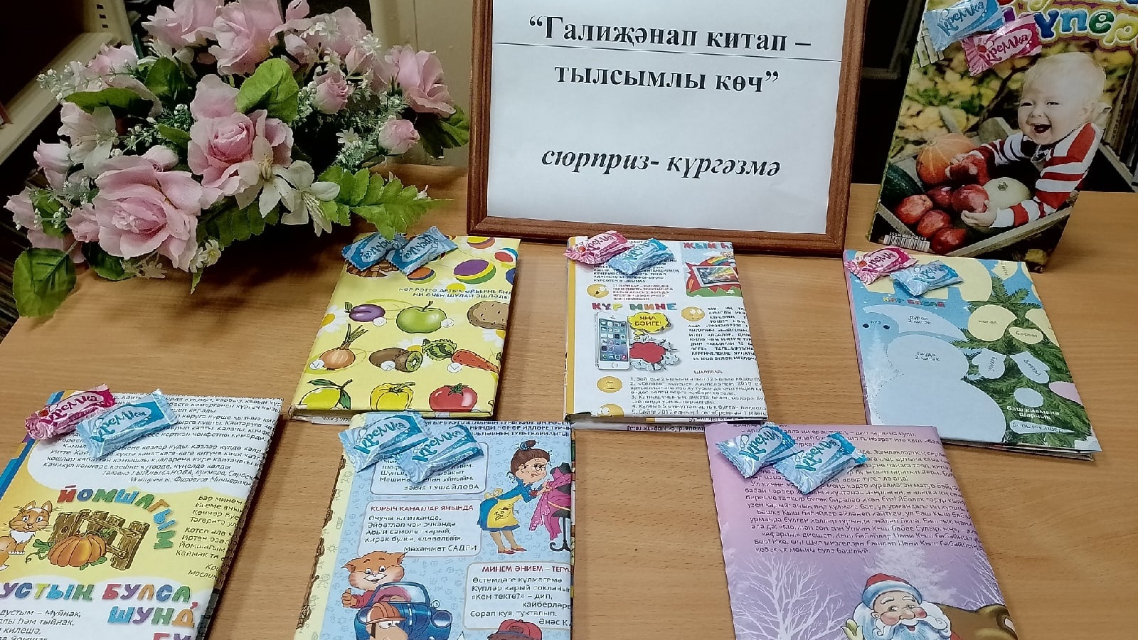 Китаплар рәсемле тышлыклар астында яшерелгән һәм аларга тәмле конфетлар ябыштырылган. Бу китапның нинди булуын, балалар тышлыкны ачып карап кына белә алачак.