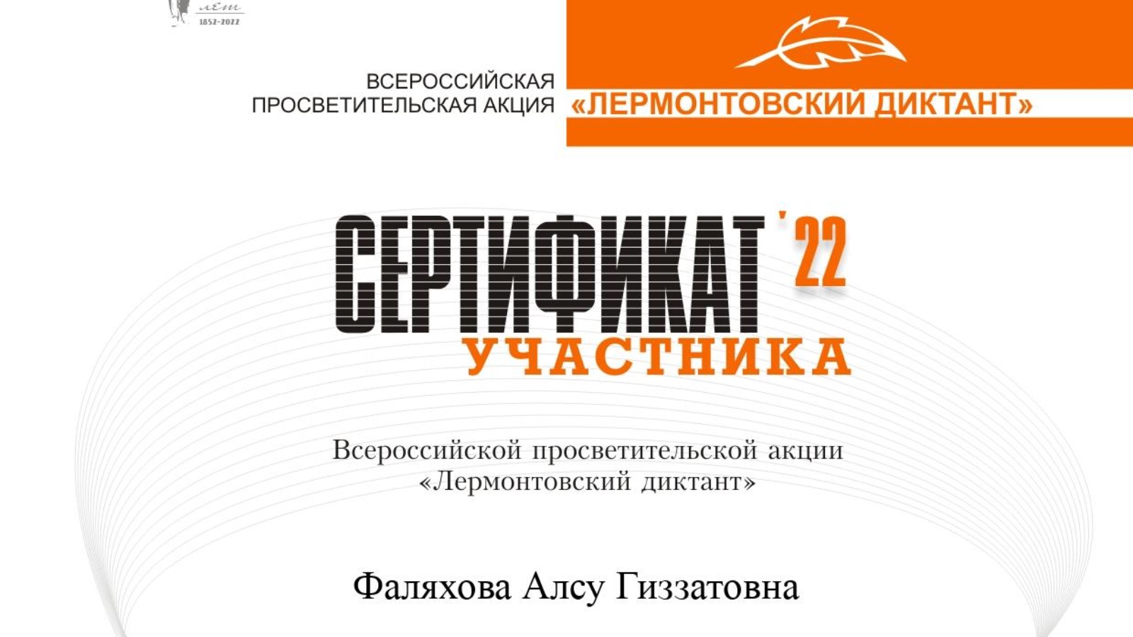 23 октябрь көнне, Айдар авылы китапханәчесе Алсу Фаляхова, Ставрополь крае М. Ю.Лермонтов исемендәге универсаль- фәнни китапханәсе үткәрә торган «Лермонтов диктанты» бөтенроссия акциясендә катнашып, катнашучы сертификатына ия булды.
