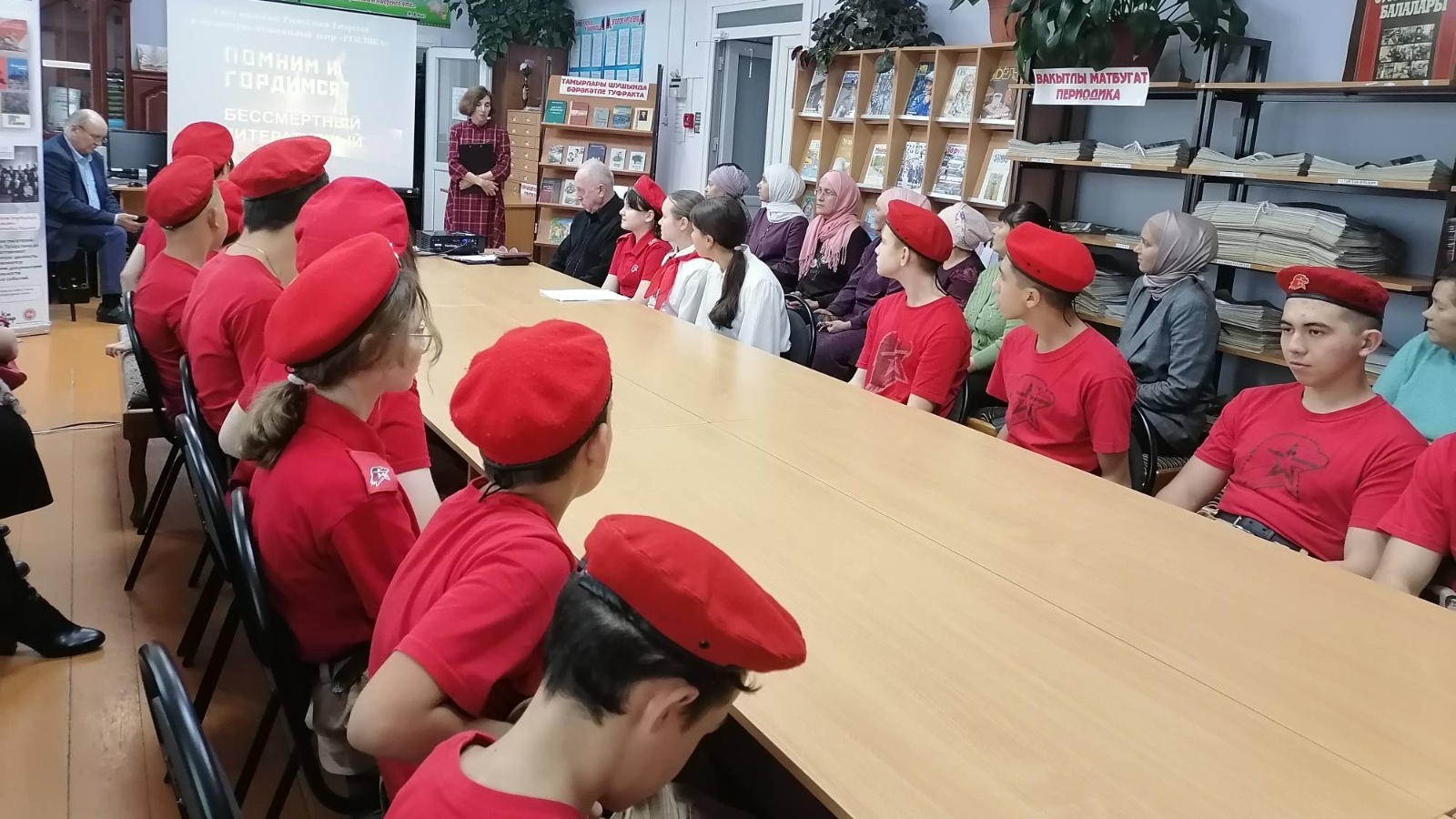 Очрашуга китап сөючеләр, Теләче урта мәктәбенең “Юнармия” хәрәкәтенең активистлары килгән иде. Алар да халкыбызның батыр уллары һәм кызлары хакында чыгышларын бүләк итте. Безгә бүгенге бай, тыныч тормышны яулап алып биргән батырлар онытылырга тиеш түгел.