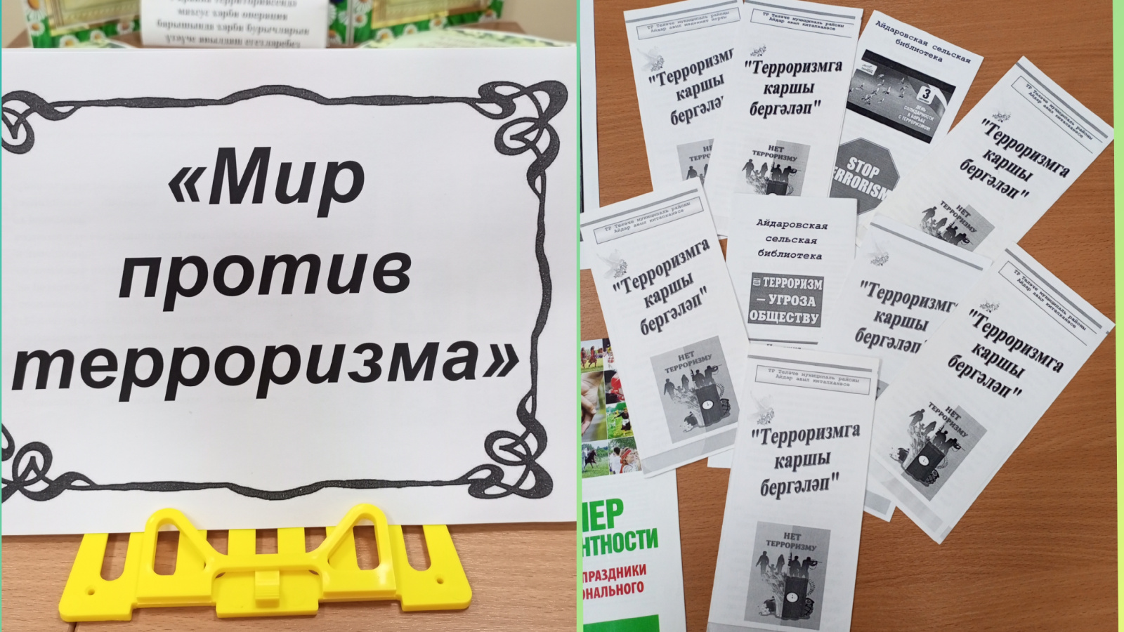 28 февраль көнне Айдар авыл китапханәсендә "Дөнья - терроризмга каршы" дип исемләнгән күргәзмә тәкъдим ителде. Күргәзмәдә террорчылыкның кайдан барлыкка килүе, үзеңне ничек якларга һәм булдырмау юлларын табарга, ә иң мөһиме: «Терроризмны ничек җиңәргә һәм нормаль кешеләр булып калырга?» дигән мәгълүмат чаралары тәкъдим ителде.
