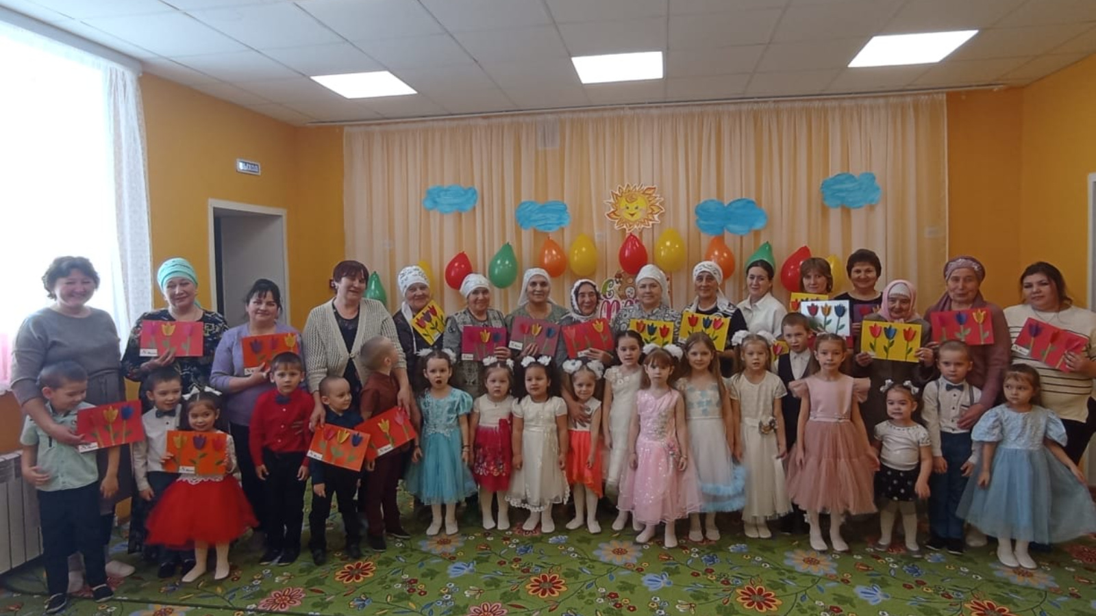 Без бу бәйрәмгә быел әбиләребезне, дәү әбиләребезне чакырдык.Әбиләре булмаганнарның әниләре килде. Балалар кадерле дәү әниләренә биюләр, җырлар, шигырьләр бүләк иттеләр. Үз куллары белән ясаган бүләкләрен тапшырдылар. Әбиләр бик яратып балаларның чыгышларын карадылар, ихластан кул чаптылар.Бакча коллективына үзләрен зурлап чакырганнары өчен рәхмәтләрен белдерделәр.