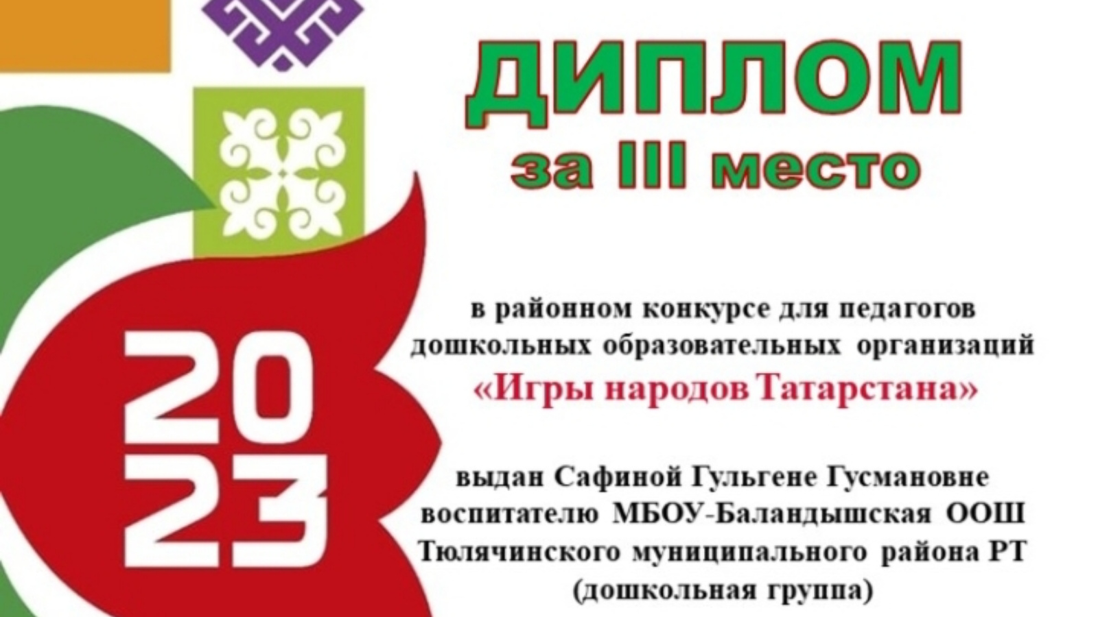 Белем бирү өлкәсендә һәрдаим төрле кызыклы бәйгеләр оештырыла. Безнең Баландыш төп мәктәбенең мәктәпкә әзерлек төркеме балалары да әлеге конкурста бик теләп катнашалар. Үзләренең тырышлыкларының нәтиҗәсе өчен һәрчак тиешле бүләкләрен дә алалар. Бу юлысы без “Татарстанның милли уеннары” бәйгесендә катнашып, өченче урынга лаек булдык.