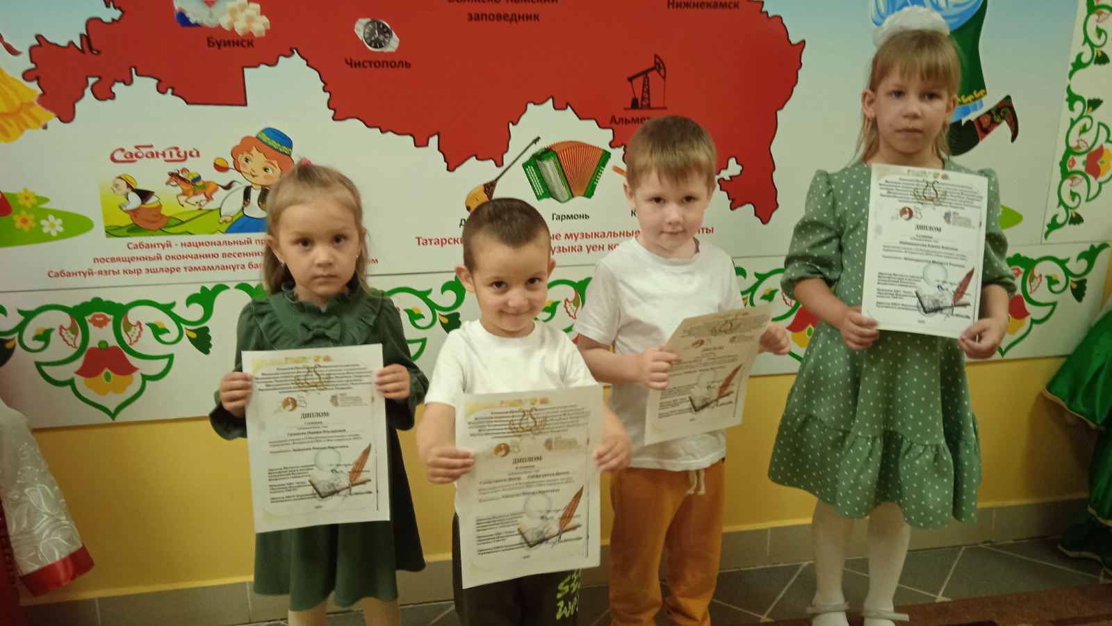 1 дәрәҗә диплом белән Шәймәрданова Азалия А. (укытучы-логопед Шәймәрданова М.Н.), Галимова Индира И. (тәрбияче Хәбирова Ф.Ф.), 2 дәрәҗә диплом белән Сәйфетдинов Дамир Р. һәм Сәйфетдинов Данил Р. бүләкләнде (тәрбиячесе Хәбирова Ф.Ф.). Тәрбияләнүчеләребезне һәм аларның җитәкчеләрен котлыйбыз!