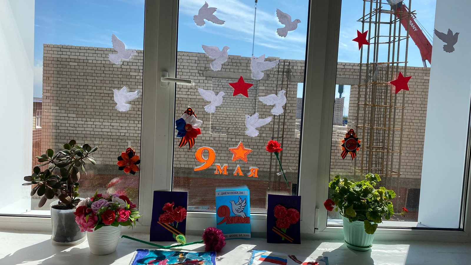 Балалар иҗат үзәге түгәрәкләренә йөрүче балалар Җиңү көне алдыннан “Җиңү тәрәзәләре ” Бөтендөнья акциясенә бик теләп катнаштылар. Алар үз сыйныф бүлмәләренең тәрәзәләрен тынычлык күгәрченнәре фигуралары, котлау язулары, бәйрәм открыткалары белән бизәделәр. Укучыларның иң зур теләге сугышның тиз көннәрдә тәмамлануы, күкләребезнең аяз һәм тыныч булуы.