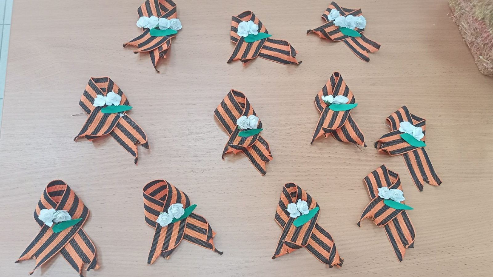 5 май көнне Шәтке авылы мәдәният хезмәткәрләре берләшмәләргә йөрүче балалар белән Георгий тасмасы ярдәмендә брошкалар ясадылар.