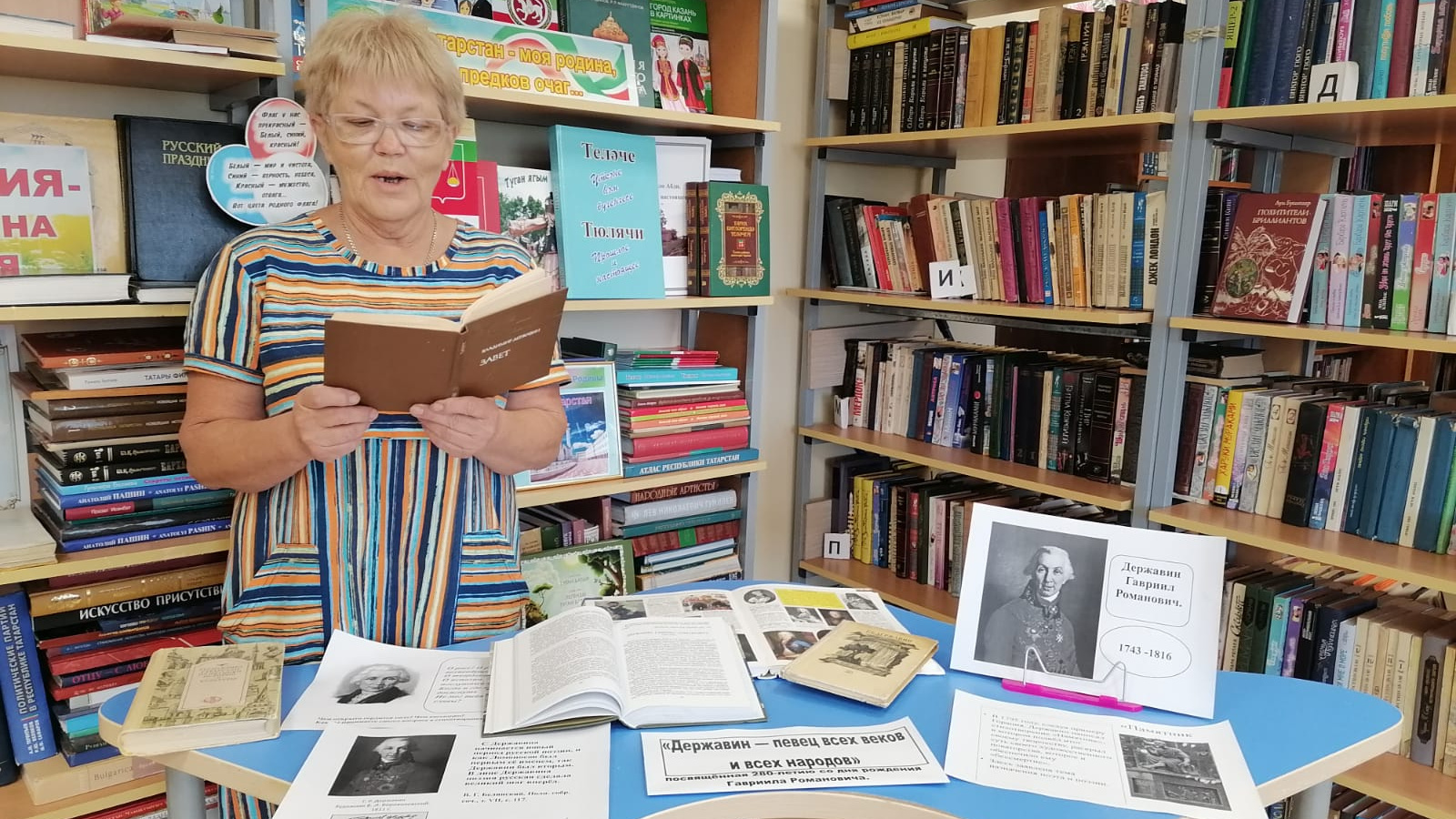 Державин - мәгърифәт чорының танылган шагыйре, Россия империясенең дәүләт эшлеклесе. Фонвизин һәм башка фән һәм мәгариф өлкәсендәге күренекле шәхесләре белән берлектә, Гавриил Романович рус теленең беренче аңлатмалы сүзлеген туплауда һәм бастыруда катнашкан. Шулай ук, ул Россиянең беренче рәсми булмаган гимнның авторы. Китапханәгә килгән китап укучылар танылган шагыйрьнең тормышы һәм иҗаты турында әлеге һәм башка бик күп яңа кызыклы фактлар турында тулырак мәгълүмат алды.