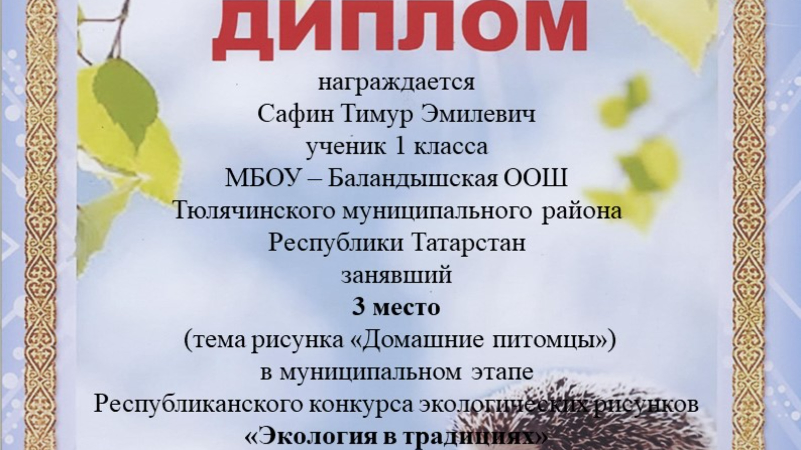 «Экология традицияләрдә» Республика экологик рәсемнәр конкурсында Баландыш авыл китапханәсеннән Сафин Тимур катнашты. Ул «Өйдәге йорт хайваннары» темасы буенча 3 нче урынны алды һәм диплом белән бүләкләнде.