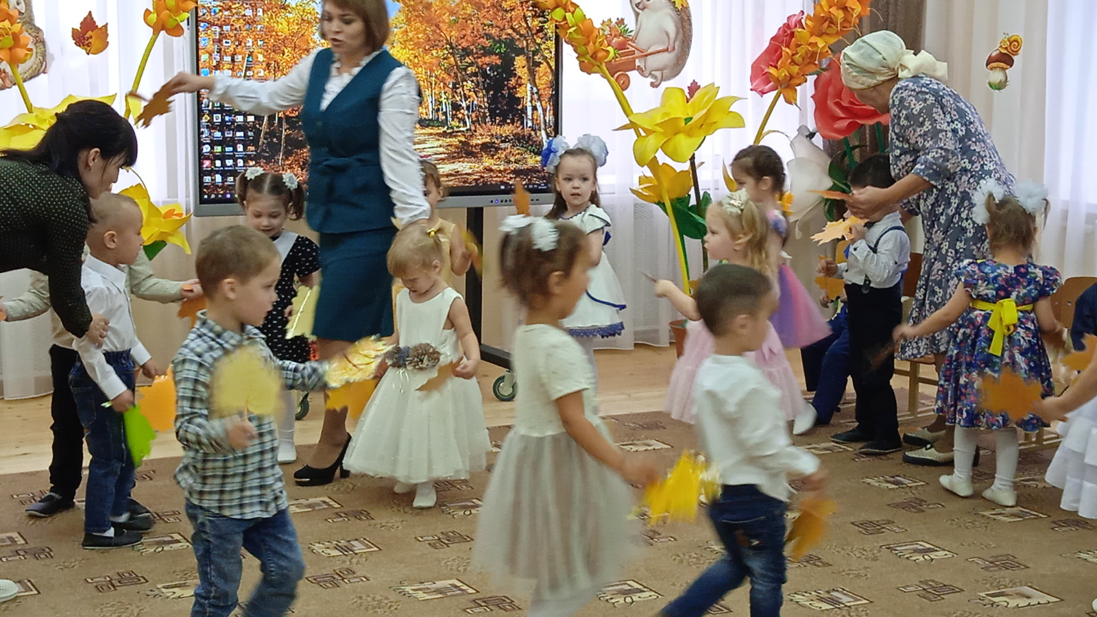 Бәйрәм музыка залында күңелле музыка белән башланды. Беренче булып үз бәйрәмнәрен икенче төркем тәрбияләнүчеләре күрсәтте. Балалар көз турында җырлар җырладылар, биеделәр һәм хәрәкәтчән уеннарда актив катнаштылар. "Шалкан" әкиятен күрсәттеләр. Барлык балалар да уңай эмоцияләр алдылар һәм бәйрәмнән канәгать калдылар.