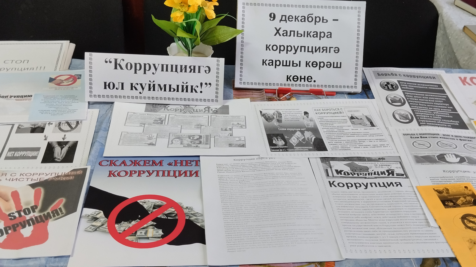 9 декабрь - Халыкара коррупциягә каршы көрәш көне. Әлеге датага карата Урта Мишә авыл китапханәсендә клуб белән бергә “Коррупциягә юл куймыйк!” исемле темага күргәзмә куелды. Күргәзмәгә Русиядә коррупциягә каршы дәүләт сәясәте һәм көрәш чаралары турында материаллар, буклетлар тәкъдим ителде. Коррупция - хәзерге заман җәмгыятенең иң кискен проблемаларының берсе. Ә иң куркынычы шул: ул гадәти хәлгә, безнең тормыш рәвешенә әйләнеп бара.