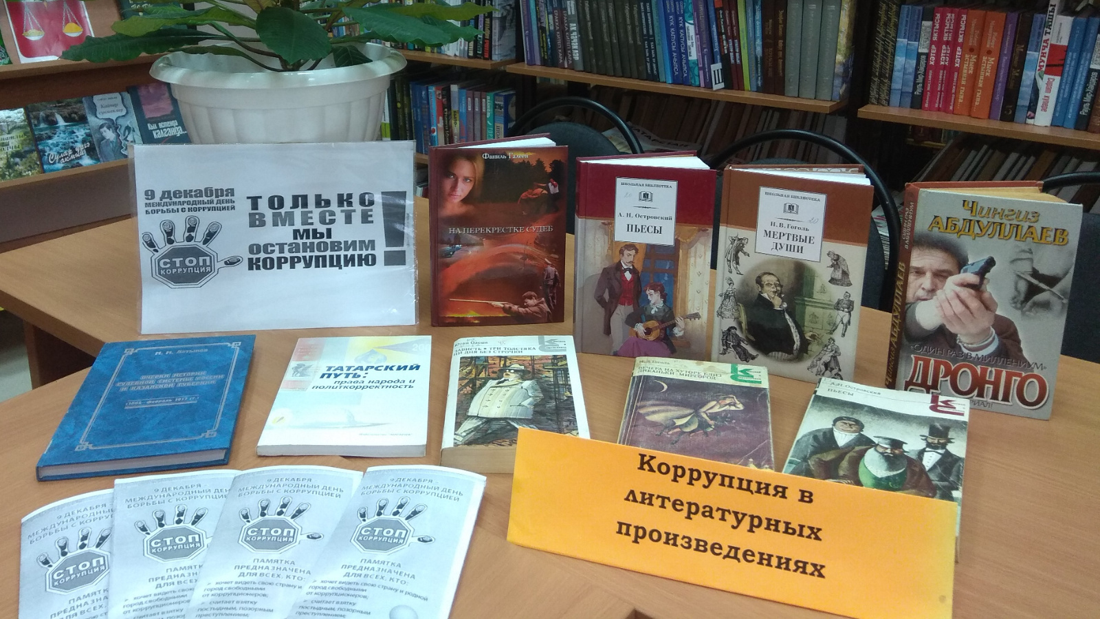 Шәдке авыл китапханәсендә бу көнгә «Коррупция в литературных произведениях» дигән күргәзмә - күзәтү ясалды. Рус әдәбияты һәрвакыт иҗтимагый тормыш күренешләрен чагылдыра, һәм анда ришвәтчелек темасы мөһим урын алып тора. Һәр рус язучысы диярлек бу проблеманы күтәрә.