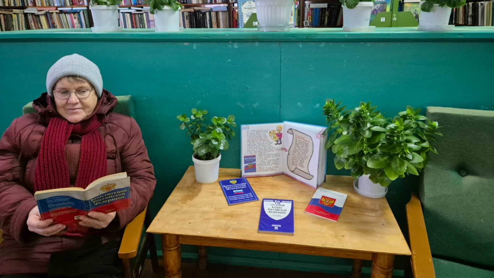 Китапханәдә 10 декабрь көнне әлеге бәйрәмгә «Дәүләтнең төп законы» дигән китап күргәзмәсе оештырылды. Күргәзмәдә Конституция төзелү тарихына багышланган китаплар һәм уку материаллары тәкъдим ителде. Китапханәче китап күргәзмәсенә күзәтү ясады. Чарада катнашучылар Россия Конституциясе - дәүләтнең төп законы, ягъни илебез гражданнары үзләре өчен билгеләгән иң төп кагыйдәләр исемлеге икәнен белделәр. Конституциядә иң мөһиме - кеше, аның хокуклары һәм ирекләре.