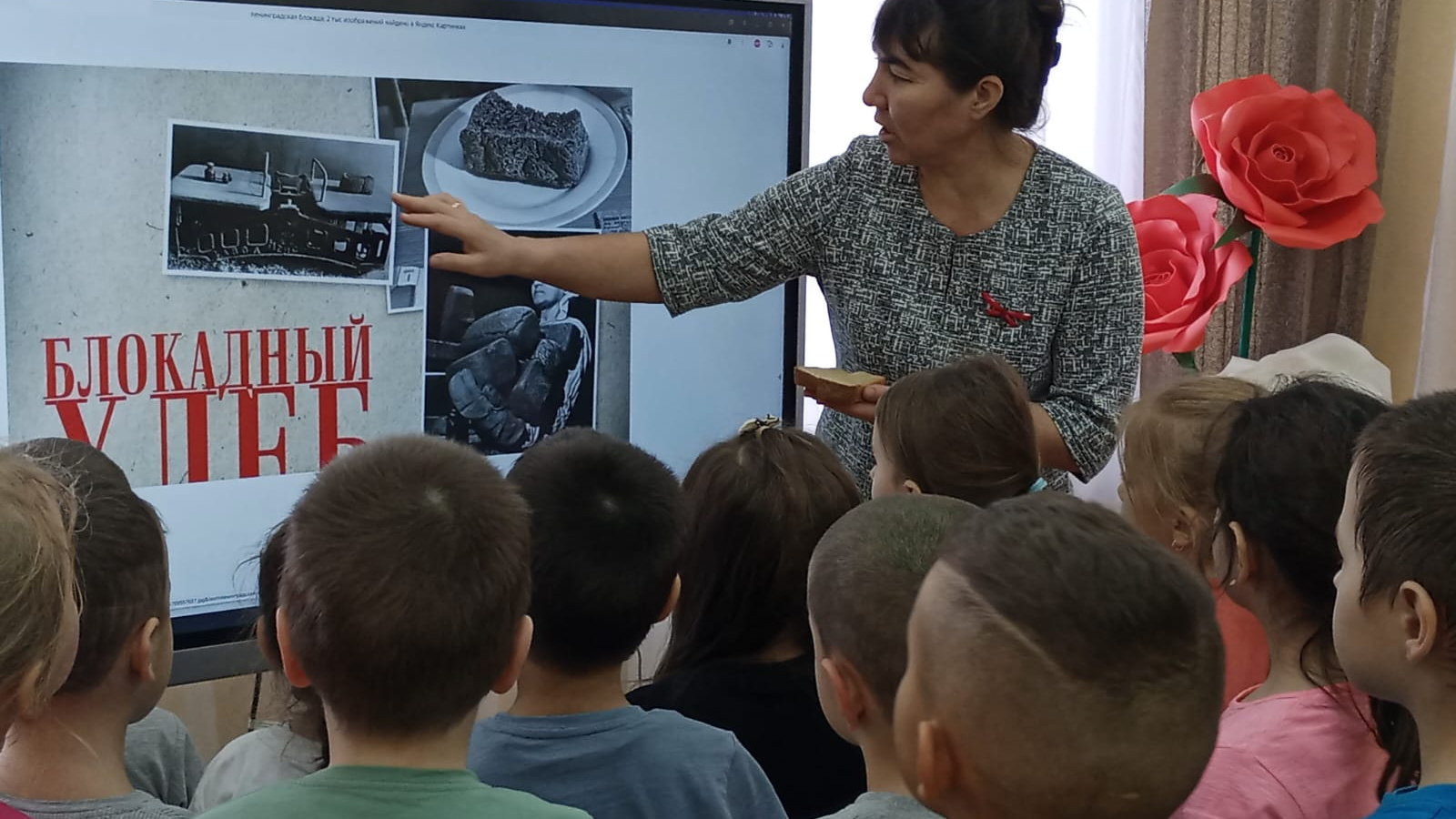 Хуҗина Р.Г. тәрбияче икмәк, аның ленинградлылар тормышындагы роле турында әңгәмә үткәрде. Презентация буенча балаларга Ленинград блокадасы, тормыш юлы, бу коточкыч вакытта кешеләрнең ничек яшәве һәм исән калуы турында сөйләде.