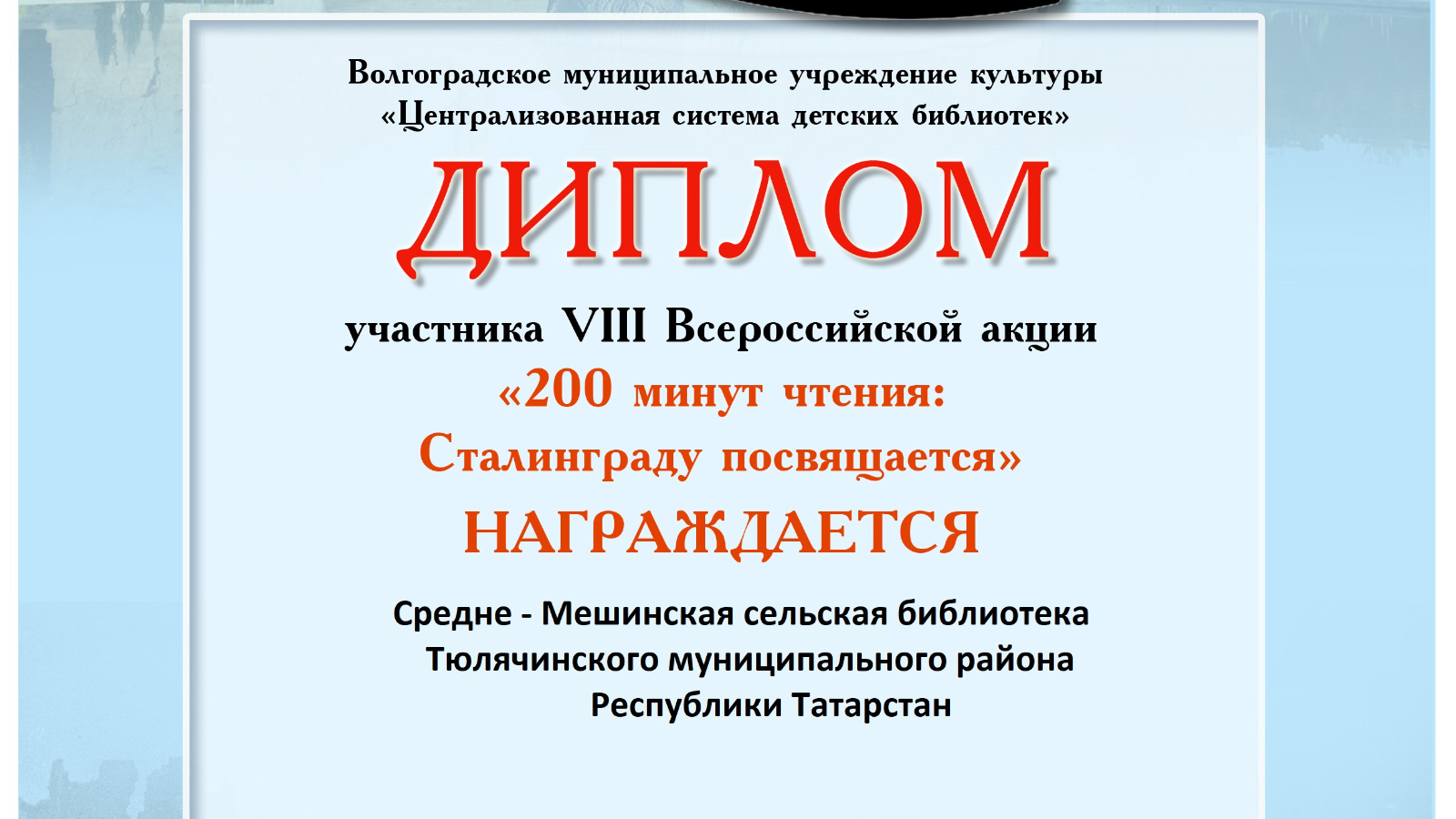 Татарстан Республикасы Теләче муниципаль районының Урта Мишә авыл китапханәсе «200 минут уку: Сталинградка багышлана» дигән VIII Бөтенроссия акциясендә катнашты һәм диплом белән бүләкләнде. Акция кысаларында Юрий Бондаревның «Горячий снег» ("Ялкынлы кар") романыннан өзекләр кычкырып укылды.