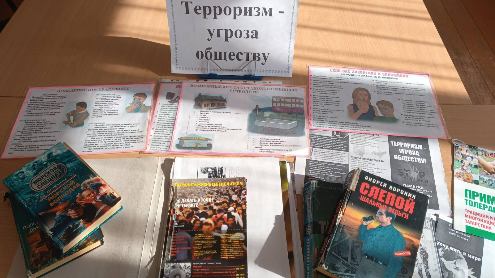 Әлеге күргәзмә халыкка террорчылык актларының юллары һәм төрләре, террорчы белән очрашканда үз-үзеңне тоту кагыйдәләре һәм җәмәгать урыннарында шикле әйберләр табылган очракта кирәкле гамәлләр турында мәгълүмат бирүгә юнәлдерелгән. Китап күргәзмәсе килүчеләргә террорчылык акты белән турыдан-туры бәйле күп кенә файдалы мәгълүматны белергә ярдәм итәчәк. Террорчылык темасы бүгенге көндә актуаль булып кала бирә. Күргәзмәдә укучыга террорчылыкка каршы көрәш проблемаларын ачучы матур әдәбияттан да китаплар тәкъдим ителде. Укучылар безнең китап күргәзмәсе белән танышып, кешелекнең террорчылык һәм экстремизм кебек глобаль проблемаларын күпкә төгәлрәк һәм тирәнрәк аңлый алачак.