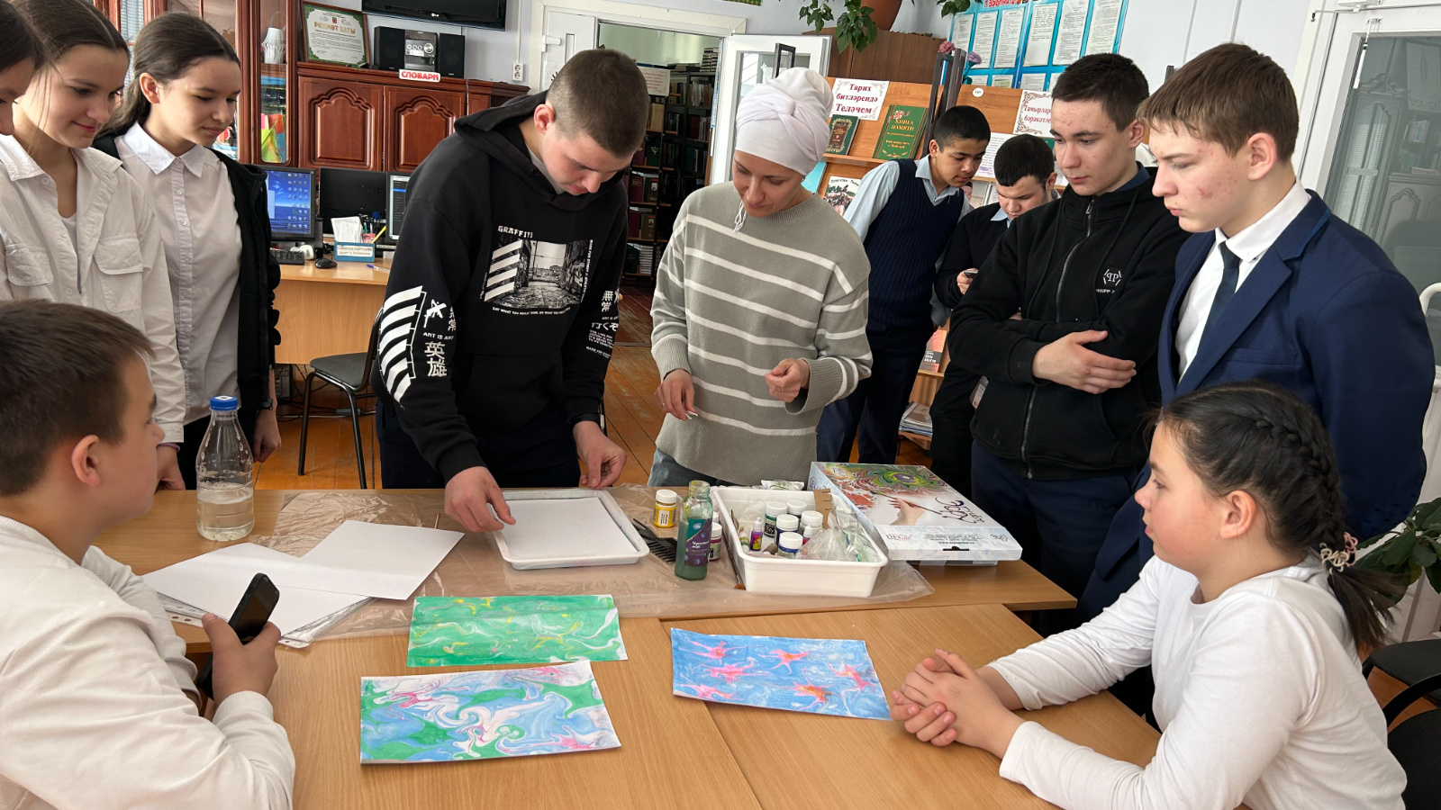 «Пушкин картасы» проекты кысаларында Теләче үзәк китапханәсенең уку залында Теләче урта мәктәбенең 7 «А» сыйныфы укучылары өчен «Эбру-матурлык дөньясы» исемле мастер - класс үткәрелде.