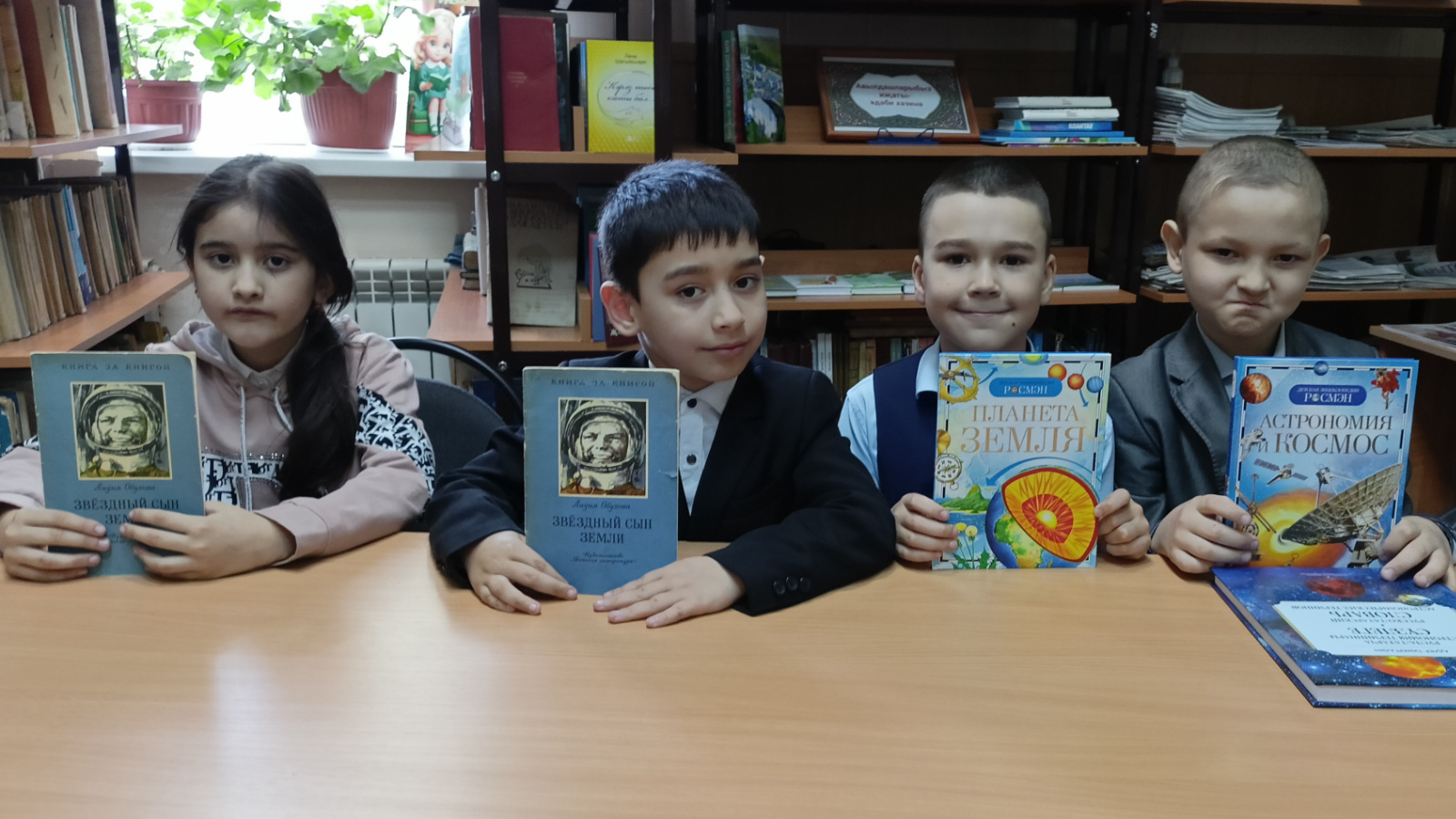Балалар белән беренче космонавт Ю.Гагаринның биографиясе белән таныштырылды. “Звездный сын земли” китабыннан өзекләр, аның Клушино авылында узган балачагы турында хикәя укылды. Укучылар космонавт турында бик теләп укыдылар.