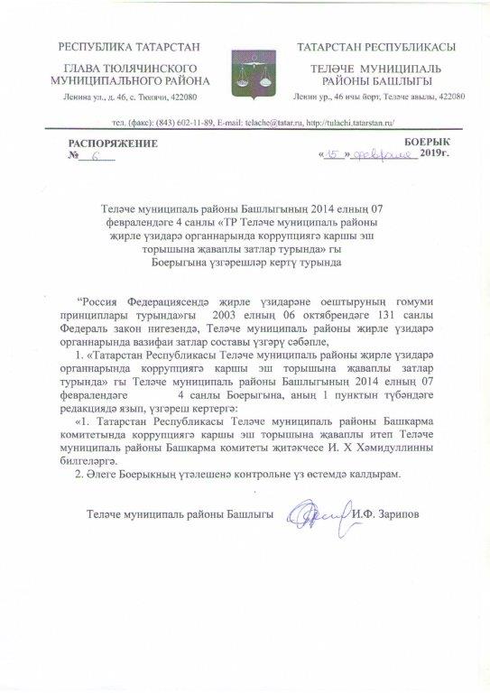 Теләче муниципаль районы Башлыгының 2014 елның 07 февралендәге 4 санлы «ТР Теләче муниципаль районы җирле үзидарә органнарында коррупциягә каршы эш торышына җаваплы затлар турында» гы